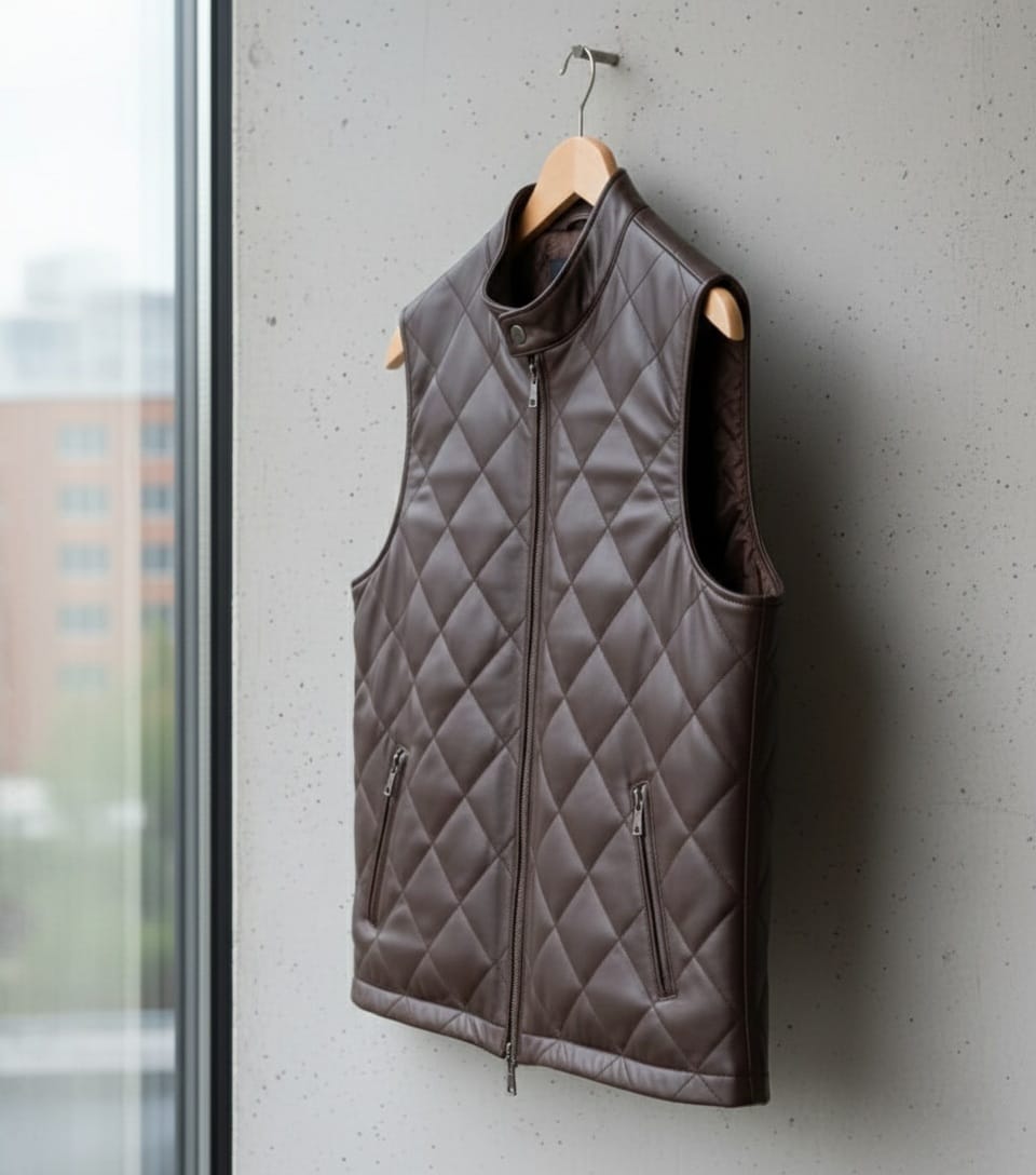 Elevate your layering game with the Cognac Quilted Gilet. Crafted from rich, warm brown leather, this premium piece features uniform diamond quilting for refined texture and subtle insulation. Designed with a sleek full-length zipper, snap-button band collar, and functional zippered side pockets, it offers both style and practical warmth—making it a versatile seasonal essential.